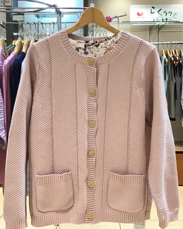 シンプルながら綺麗な春色で、前をとめてセーターとして、前を開けて羽織りものとして、着回し自由♪