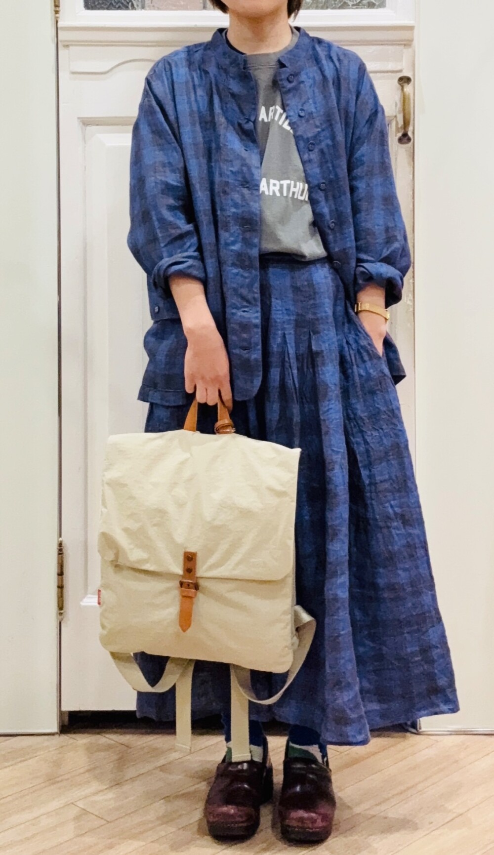 少し丈が長めの切替あり麻シャツに綿ツイルルーズパンツを合わせた